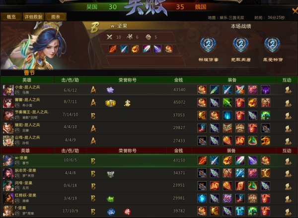 24分钟,吴国吹响号角上路推进,吴魏爆发激烈团战,魏国阵型分散令吴国大控难以发挥效果,吴国4换1团战失利,吴魏比分30:29,吴国经济领先4K。33分钟,魏国集合进攻吴国下路高地,吴国通过拉扯艰难2换3团战取胜。35分钟,魏国BOSS点刷新炎魔,吴国中路推进,吴魏爆发激烈团战,吴国先手集火击杀魏国马腾后团战占优,吴国最终2换5团灭魏国,吴魏比分39:46,吴国经济领先1.1W。37分钟,吴国集合中路突袭,魏国人员不齐被迫接团,吴国梦孙策拿下三杀帮助己方无伤团灭魏国,吴国回身封印魏国BOSS炎魔,梦孙策拿下复活,孙权拿下号角。38分钟,吴国吹响号角进攻魏国中路高地,魏国疲于处理兵线放弃防守,吴国趁势攻破魏国中路高地。吴国假意撤退后魏国展开追击,吴国果断反打无伤团灭魏国,吴国顺势攻破魏国上路,铜雀台相继被吴国摧毁,坚果取得第二局比赛的胜利。