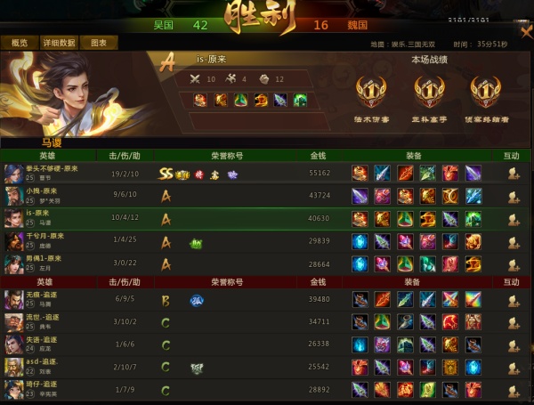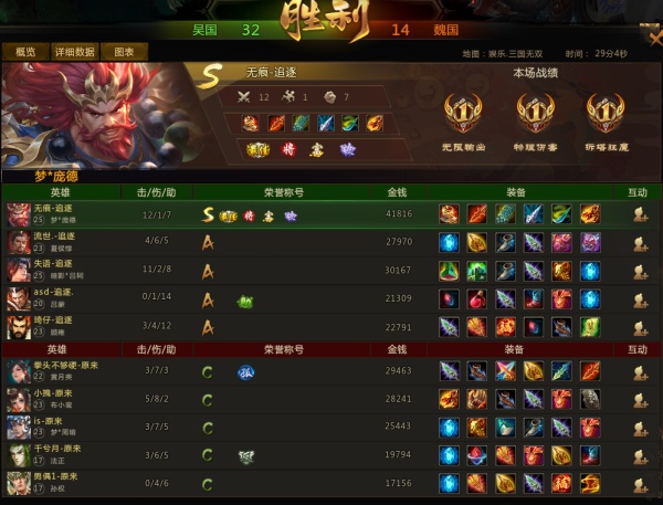 21分钟,双方爆发团战,魏国梦周瑜率先跳至河道骚扰敌方前排吕蒙,但被吴国梦庞德击杀,魏国法正紧跟其上大招困住梦庞德但队友并未跟上,法正阵亡,随后吴国抱团进魏国下路野区,魏国黄月英、孙权先后阵亡,吴国斩杀炎魔,梦庞德获得复活和号角,至此吴魏双方人头比为19:13,吴国经济领先5000。23分钟,吴国吹响号角抱团三中路下路带线,一分钟后推进高地,魏国站位分散团战再次落败,魏国中路高地告破,随后,双方上路高地爆发团战,魏国四人阵亡上路和下路先后告破。27分钟,吴国抱团直逼敌方主基地,吴国摧毁敌方铜雀台,吴国获胜!