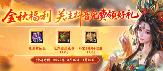 关注梦三国抖音就可获得关注礼包:活跃自选礼包(7天)*5,藏龙紫仙玉(7天)*200,珍宝自选珍材宝箱(7天)*2