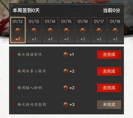 活跃任务:此外,每个游戏ID每日阅读资讯获得1积分;每周分享小程序获得2积分;每周输入秘钥获得2积分(四字秘钥可前往公众号最新发布的文章底部查找);每次游戏内签到且登录小程序获得3积分(每周可完成5次),切换大区不重复积分。