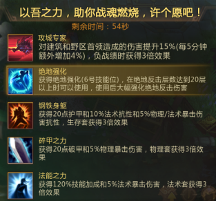 优化后:对建筑和野区首领造成的伤害提升15%(每5分钟额外增加4%),负战绩时获得3倍效果