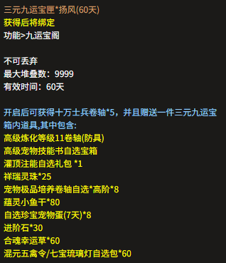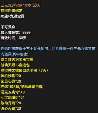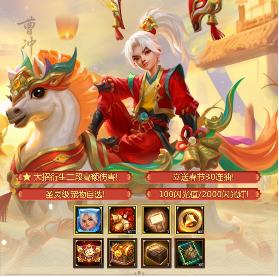 礼包内有:曹冲*天马旋梦*1、璇玑福铃*3000、闪光灯*2000、时运值*300、圣灵宠物自选福袋*1、新春福袋*1、乾坤宝匣*神骥璇玑*1、十万士兵卷轴*100。