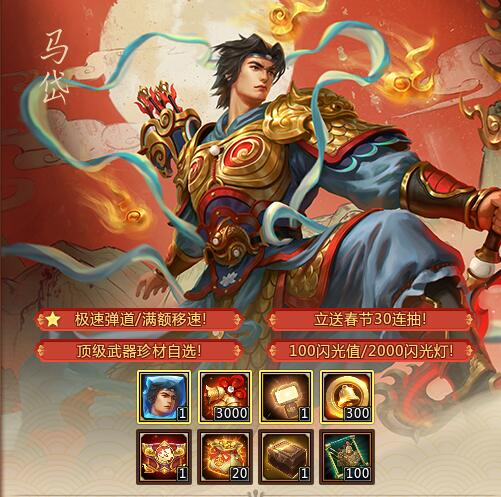 礼包内有:马岱*骏马迎春*1、璇玑福铃*3000、闪光灯*2000、时运值*300、圣灵宠物自选福袋*1、神机玄灵武器珍材包*20、乾坤宝匣*神骥璇玑*1、十万士兵卷轴*100。