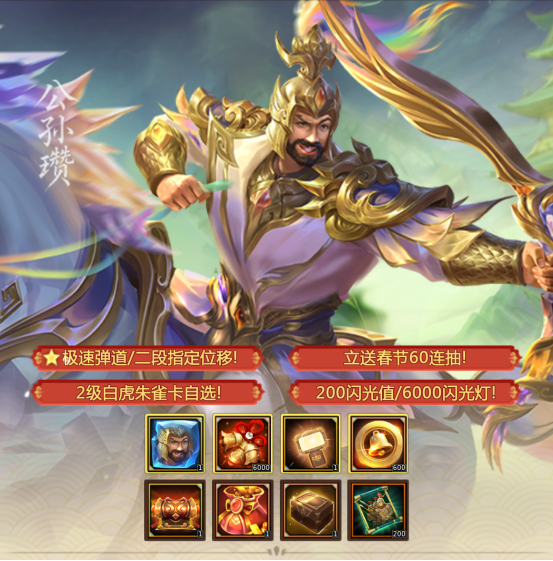 礼包内有:公孙瓒*天马将军*1、璇玑福铃*6000、闪光灯*6000、时运值*600、2级白虎朱雀自选*1、高炼10坐翅/灵脉晶髓自选*1、乾坤宝匣*神骥璇玑*1、十万士兵卷轴*200。