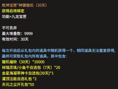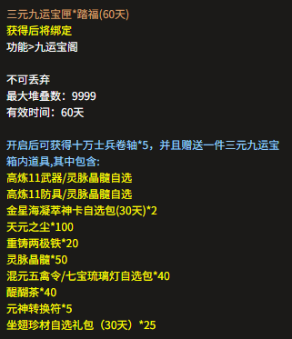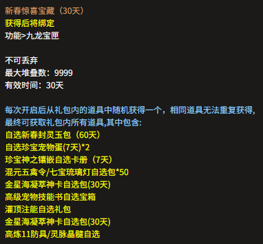 随机基础奖励包括新春惊喜宝藏、诸天众生武器自选、高炼12防具(武器)/灵脉晶髓自选、黄金闪耀宝藏包、星月武器、天地劫神魔道武器、圣灵宠物包、十一章防具、元神转换符等。