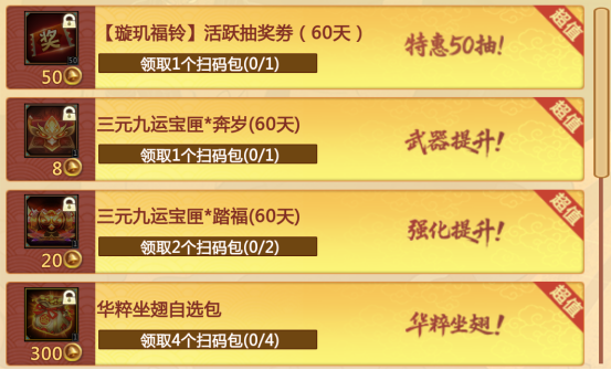 解锁1个/2个/3个扫码包,可分别消耗8/20/30时运值,兑换奔岁宝匣、踏福宝匣、扬风宝匣。