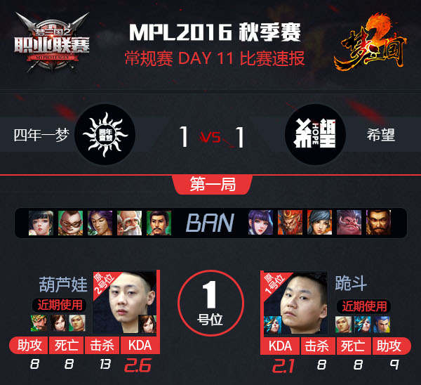 四年一梦由替补周星驰代替霸气云登场,前期双方人头打成均势,但关羽出山后,四年一梦打出了优势,随即四年一梦没有给对方发育的机会,强行抱团推进,打的希望措不及防。防御塔连续被拔,希望面临四年黄舞蝶的站桩输出毫无还手之力,四年一梦先下一城。第二局希望改变了阵容,希望中单迷魂的文鸯打出优势,再通过贾诩的游走,将优势继续扩大。后期的希望装备更新非常快,团战配合打的淋漓尽致,最终希望扳回一城。
