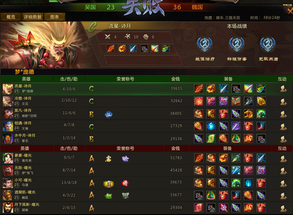 20分钟,吴国方抱团进攻魏国上路二塔,吴国马腾为了摧毁魏国上路二塔被魏国方集火击杀,吴国刘协想要保护马腾却在魏国左月大招的控制下被击杀。21分钟,吴国吹响上古号角进攻魏国中路高地,吴国夏侯渊利用大招换位先手配合队友集火击杀魏国梦马超,紧接着吴国方摧毁魏国中路步兵营后撤退,此时魏国方外塔全部告破。25分钟,魏国梦马超在中路河道暴露视野后被吴国方集火秒杀,吴国应龙则跳至魏国左月身旁一套连招将其击杀,魏国钟会孤立无援也被马腾击杀。29分钟,魏国乐进三人在魏国野区被吴国方围剿击杀阵亡。31分钟,第二个上古炎魔在吴国BOSS处刷新,魏国乐进在上路河道暴露视野被吴国应龙利用三技能限制在河道高台击杀,随后吴国方击杀上古炎魔,马腾获得炎魔之焰及上古号角,此时吴魏比分39:19,吴国经济领先30000。33分钟,吴国吹响上古号角进攻魏国下路高地,魏国乐进先手清理兵线被吴国方集火击杀,随后吴国方摧毁魏国下路步兵营撤退;与此同时吴国上路兵线摧毁魏国上路步兵营。36分钟,吴国方进攻魏国上路高地,魏国方团战再次失利C位接连阵亡,吴国方借此机会摧毁魏国三路高地,赢得本场比赛胜利。