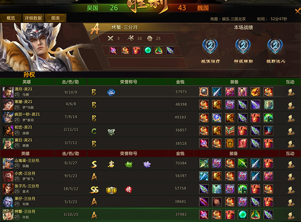 31分钟,吴国集合进攻魏国上路高地,魏国孙权一人吸引吴国众多伤害,魏国随即展开反打1换3团战取胜逼退吴国。33分钟,吴国BOSS点刷新炎魔,吴魏围绕炎魔拉扯近2分钟,最终吴国1换2逼退魏国后封印炎魔,马腾拿下复活,顾雍拿下号角;同时吴国神化枪兵摧毁魏国上路机弩射场。37分钟,吴国吹响号角进攻魏国中路高地,魏国分兵处理兵线防守吃力,吴国击杀敌方孙权后攻破魏国中路高地。43分钟,魏国突袭吴国远古野区,吴国人员过于分散被迫接团败阵,魏国无伤击杀吴国4人,吴魏比分24:30,魏国经济反超6K。46分钟,魏国集合进攻吴国下路高地,吴魏团战打响,魏国孙权双大帮助袁术打出高额伤害,最终魏国无伤团灭敌方并攻破吴国下路、中路高地。48分钟,魏国集合推进吴国上路,吴国主动出击但团战不敌,魏国无伤击杀敌方4人再破吴国上路高地,吴国三路已破无力回天。51分钟,魏国封印吴国BOSS上古炎魔,随后魏国吹响号角攻破虎神塔,三分月取得第一局比赛的胜利。