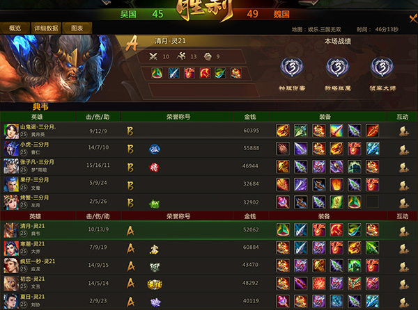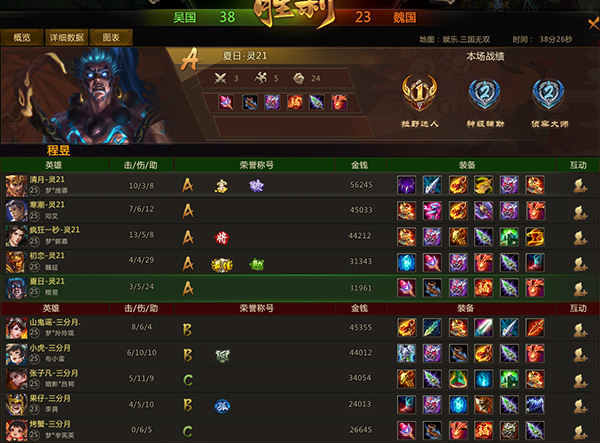 开局4分钟,吴国邓艾上路先手一套技能打残魏国梦辛宪英,暗影吕轲支援一套技能打残邓艾,魏国李典补充伤害反杀暗影吕轲拿下一血。8分钟,魏国布小蛮上路收线发育,吴国邓艾、梦郭嘉配合集火打残布小蛮,吴国魏延支援一技能收割布小蛮。14分钟,吴魏中路爆发遭遇战,魏国梦孙玲珑拿下三杀帮助己方团战取胜,吴国梦郭嘉开启大招后手支援连斩魏国5人拿下五杀,吴魏人头比16:8,吴国经济稍微领先。19分钟,魏国BOSS点刷新上古炎魔,吴国突袭封印上古炎魔,魏国暗影吕轲开启大招切入抢下复活,魏国李典紧跟切入抢下号角,吴国果断后撤脱离战斗,魏国集火击杀吴国程昱。21分钟,魏国吹响号角但并未攻破吴国任何一路高地。